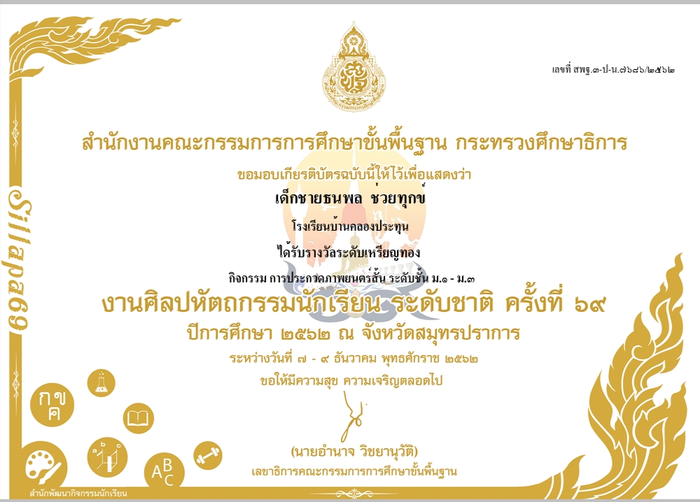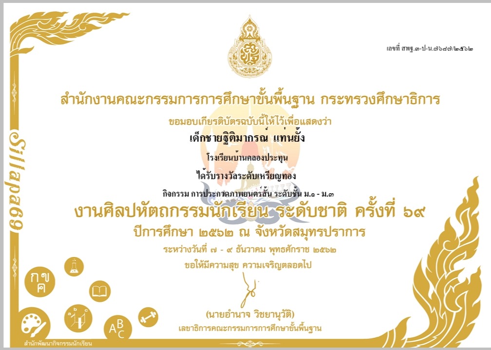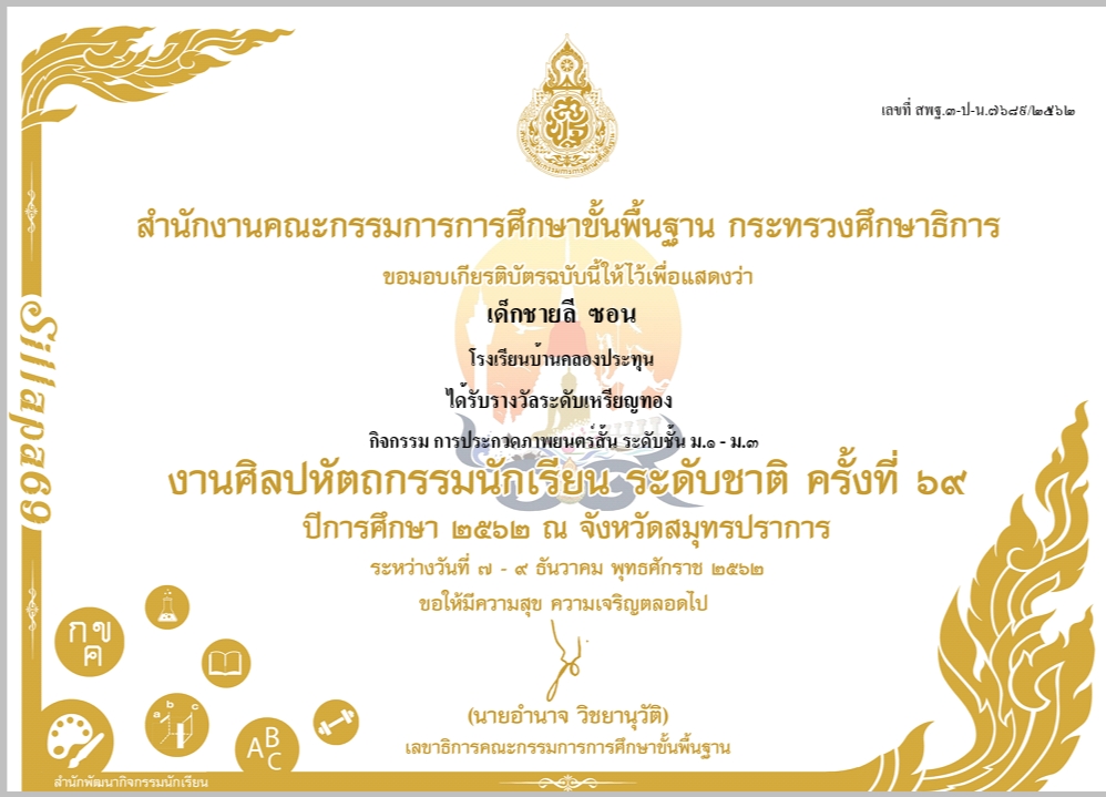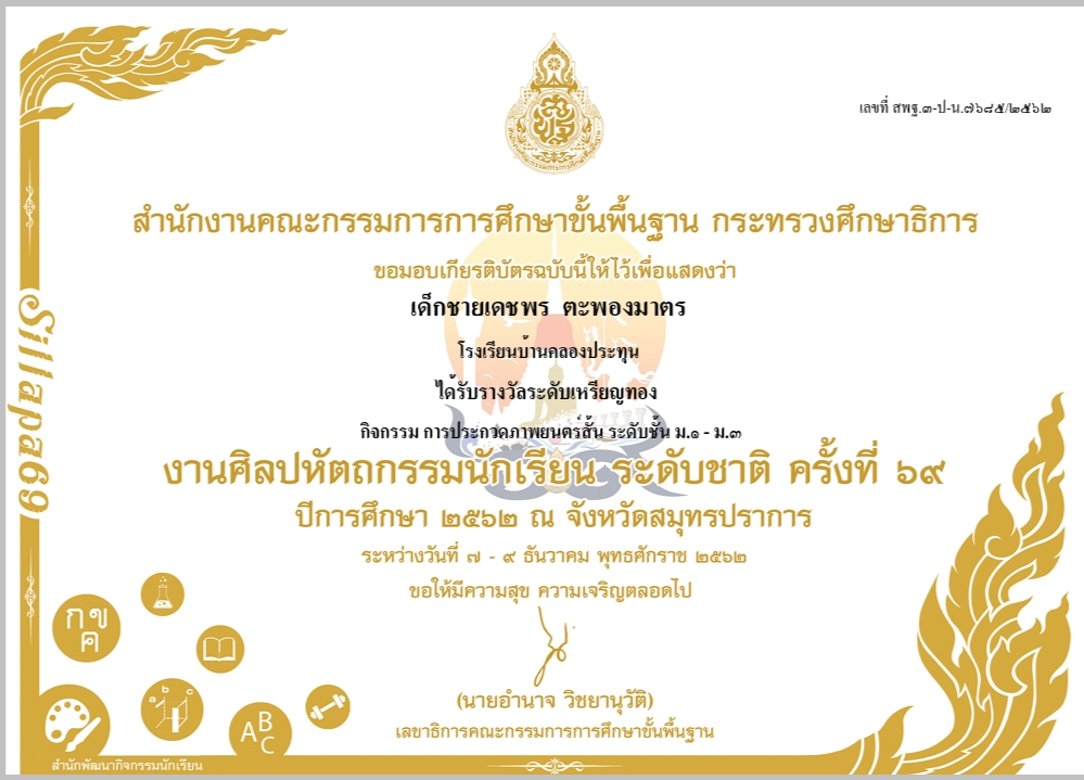 กิจกรรมการแข่งขันภาพยนตร์สั้น ระดับ ม.1-3 งานศิลปหัตถกรรมนักเรียน ได้รับรางวัลเหรียญทอง ระดับชาติ ครั้งที่ 69 จังหวัดสมุทรปราการ